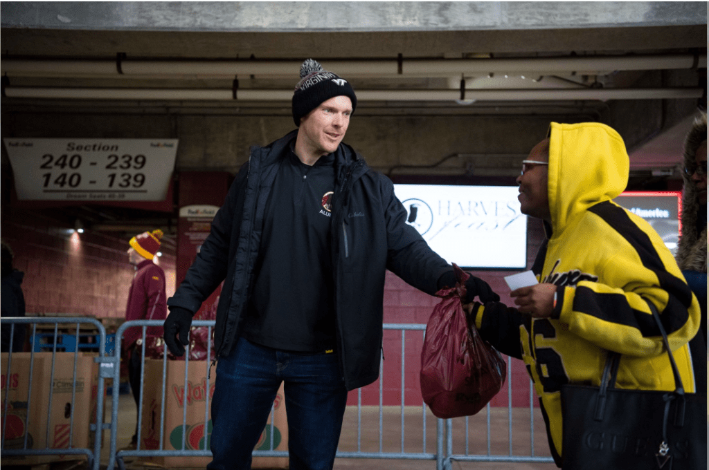 This year’s Harvest Feast is be the 17th annual pre-Thanksgiving food distribution event for Prince George’s County residents in need. This event is made possible through the generosity of our partners and sponsors, specifically, Ryan Homes, Safeway, Bank of America, Capital Area Food Bank, PepsiCo, FedEx, Prince George’s County Department Social Services and the Redskins Charitable Foundation. On Monday, 200 volunteers assisted in assembling 7,500 bags of dry goods, perishables and beverages that were distributed to families the following day, Tuesday, November 12.